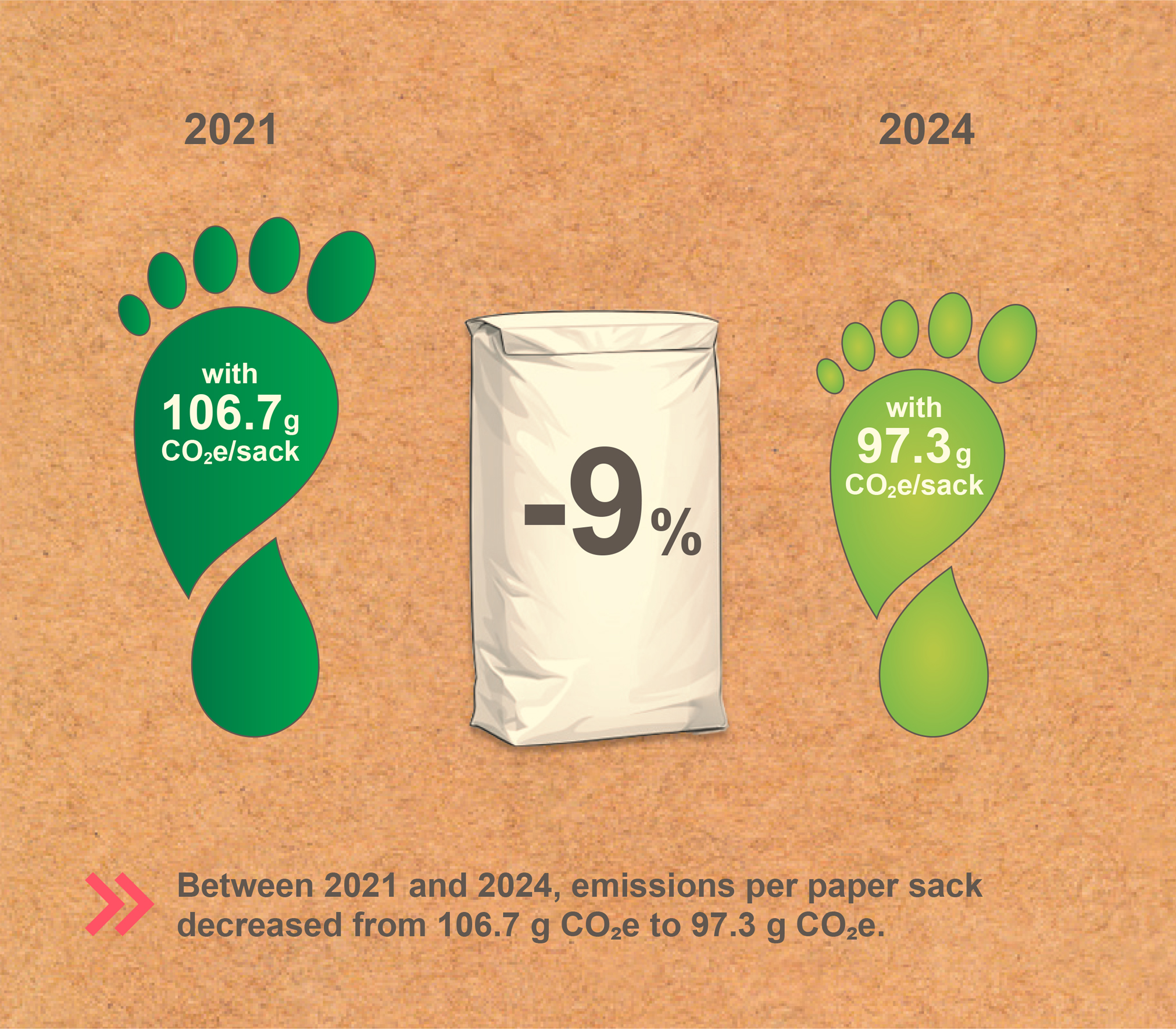 The cradle-to-gate assessment confirms a reduction in the fossil carbon footprint of average European sack kraft paper and paper sacks over a three-year period. Between 2021 and 2024, emissions per paper sack decreased by 9%, from 106.7 g CO2e to 97.3 g CO2e. The production of purchased sack kraft paper accounts for around 60% of the cradle-to-gate fossil carbon footprint of paper sacks and therefore represents the dominant emissions contributor. Emissions from sack kraft paper production were reduced by 5% per tonne over the same period, from 484 kg CO2e in 2021 to 462 kg CO2e in 2024. “These results demonstrate how our industry is driving decarbonisation through joint efforts,” explains Catherine Plitzko, General Delegate of EUROSAC. “The findings of this study will help us to further refine our net zero pathway and identify where we can achieve the greatest impact.”
