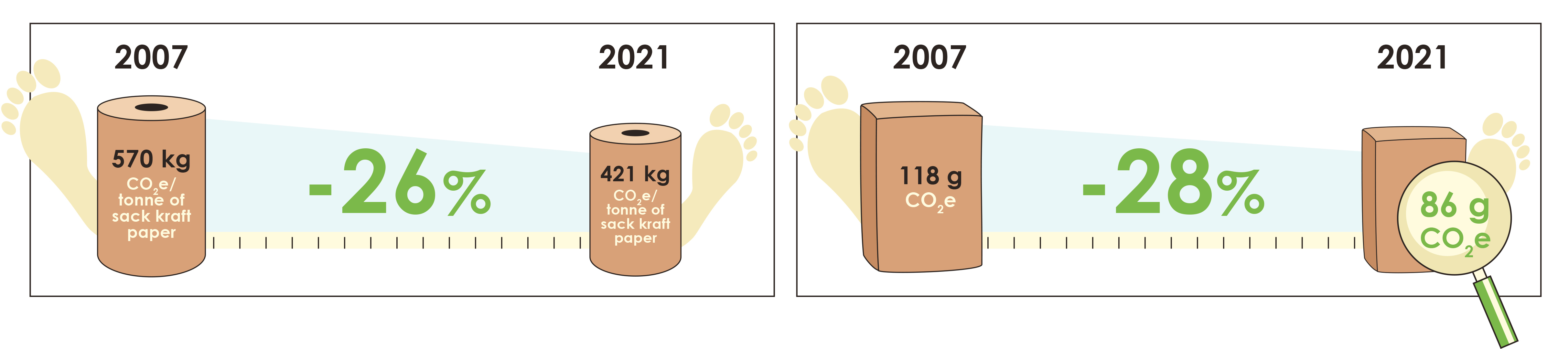 - Per paper sack, the figures show a 28% improvement – from 118 g CO2e per sack in 2007 to 86 g CO2e per sack in 2021. It can be attributed to reductions in sack weight and in fossil fuel consumption.