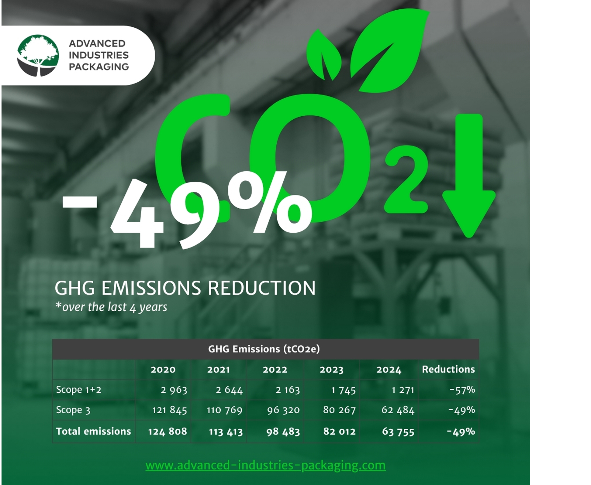 Between 2020 and 2024, Advanced Industries Packaging, AIP, reduced its Scope 1 and 2 emissions by 57% and total GHG emissions by 49%. Among others, these achievements can be attributed to: